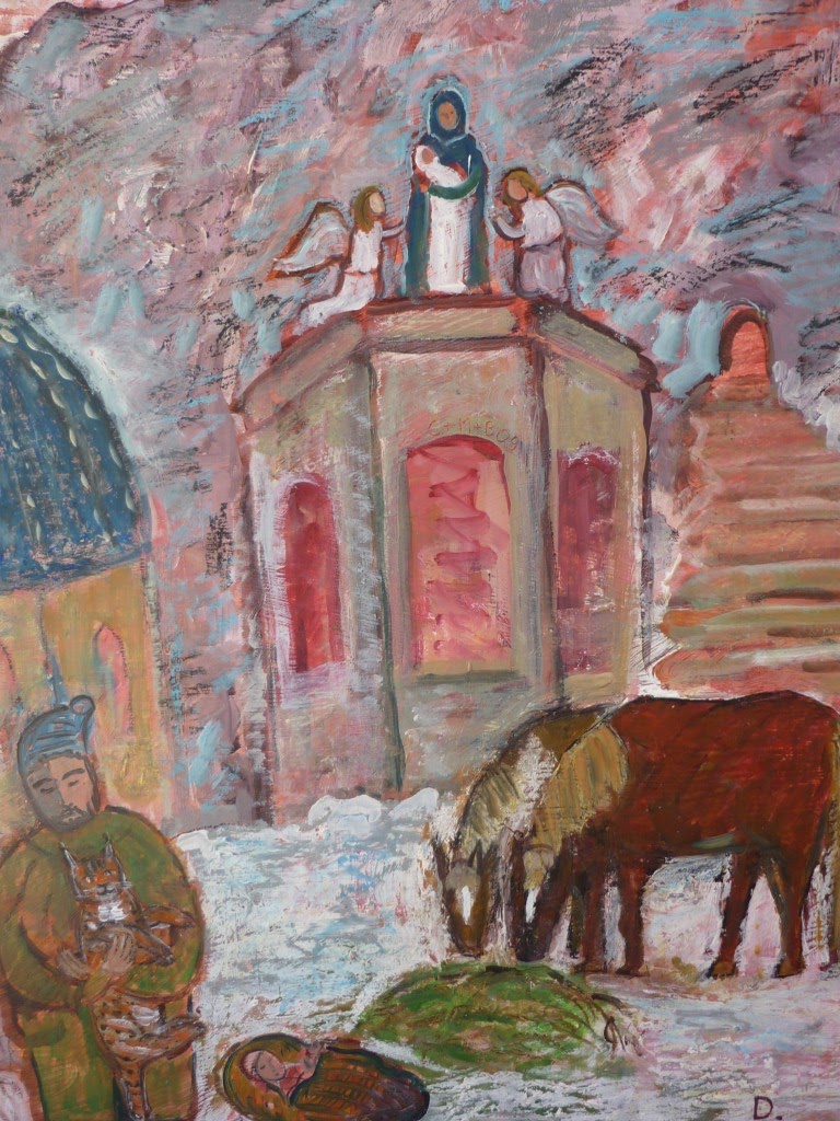 Es ist Winter, Abendstimmung nach einem klaren Tag. Wir befinden uns an einem mystischen felsigen Ort mit einer Berg-Kapelle, einer Basilika und einem Gebäude, auf welchem drei Figuren thronen: Maria mit dem Jesuskind, von zwei Engeln flankiert - Steinskulpturen, farbig gefasst. Die Gebäude stehen vor einem steilen Felsengebirge. Rechts befindet sich eine Treppe, die zu einem erleuchteten Tor im Felsen führt.