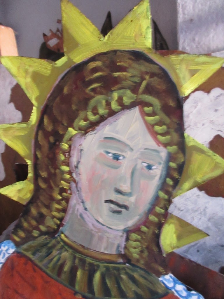 Doch damit habe ich mich noch nicht begnügt. Ein dritter Engel mit Sternenkranz muss her, denn ich dachte an eine Platzierung am Engelweg und kann keinen der beiden hier und jetzt loslassen... Heute arbeite ich wegen Regenwetter innen im Malerzimmer.