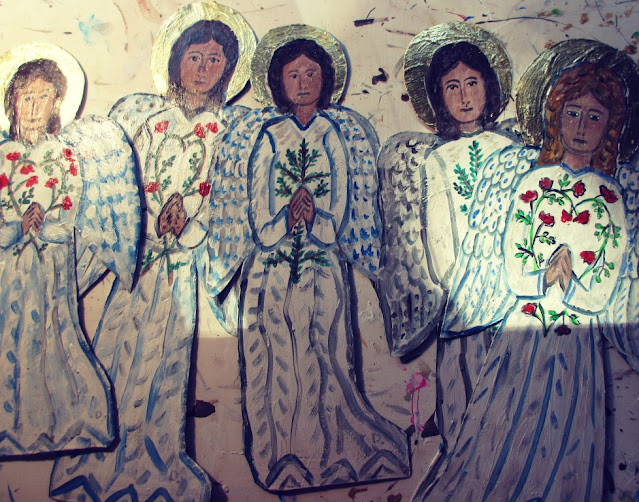 | Diese kleineren weißen Blechengel sind kürzlich als Geschenke entstanden. Einer (Detail Nr. 4) war schon "abgeflogen", als ich dieses Foto gemacht habe. (Höhe ca 30 bis 40 cm) |